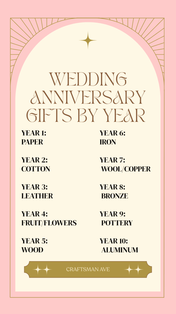 Here’s a quick look at the first 10 traditional anniversary gifts by year: